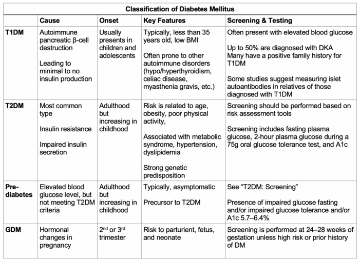 Table 1. Subclassifications of DM based on cause, onset, key features, and screening.5,6 Abbreviations: DM, diabetes mellitus; GDM, gestational diabetes mellitus; OGTT, oral glucose tolerance test.