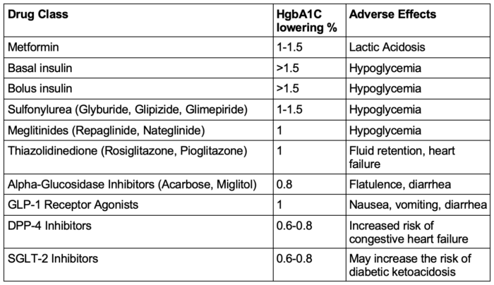 Table 2. Medications commonly used to treat type 2 diabetes. Abbreviations: HgbA1C, hemoglobin A1c; GLP-1, glucagon-like peptide-1; DPP-4, dipeptidyl peptidase-4; SGLT-2, sodium-glucose cotransporter 2. Adapted from Nathan DM. Diabetes: Advances in diagnosis and treatment. JAMA. 2015;314(10):1052-62.9/sup