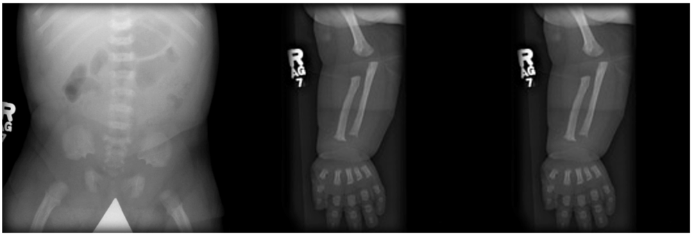 Figure 1. Plain radiographs of the upper and lower limbs demonstrate shortened long bones. The lumbar spine has a decreased transverse diameter. The iliac wings have a tombstone morphology. Gaillard F, Walizai T, Ranchod A, et al. Achondroplasia. Reference article, Radiopaedia.org. Accessed on 24 Sep 2025. Link