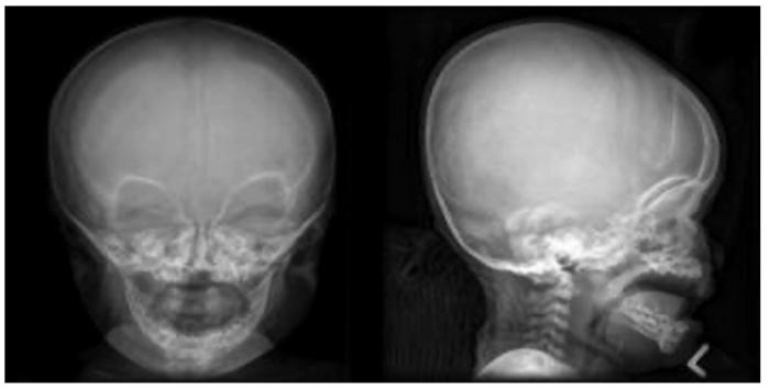 - They present with a large head size (macrocephaly), prominent forehead bossing, and a mid-face hypoplasia manifesting as a flattened nasal bridge and crowded, misaligned teeth (Figure 2). The pelvis is uniquely described to be champagne glass-shaped. This radiological appearance is characterized by flattened iliac blades, horizontal acetabulum, and narrowed sacroiliac notches.