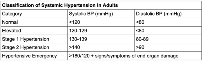 - Hypertension is defined as an average BP of more than 130 mmHg systolic (sBP) and/or more than 80 mmHg diastolic (dBP)1 (Table 1).