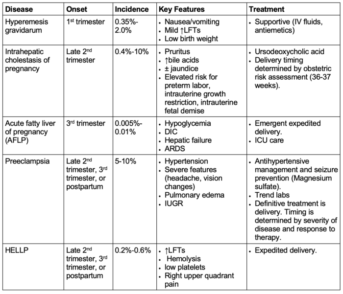 - Conditions are classified as pregnancy-specific (e.g., intrahepatic cholestasis, acute fatty liver of pregnancy, HELLP) or incidental to pregnancy (e.g., viral hepatitis, autoimmune hepatitis, Budd-Chiari).1,2