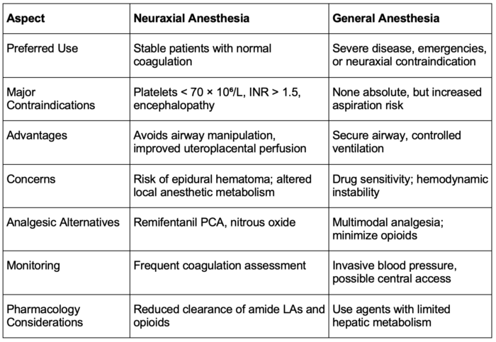 - Coagulopathy, thrombocytopenia, and encephalopathy may limit neuraxial options and increase risk with general anesthesia.