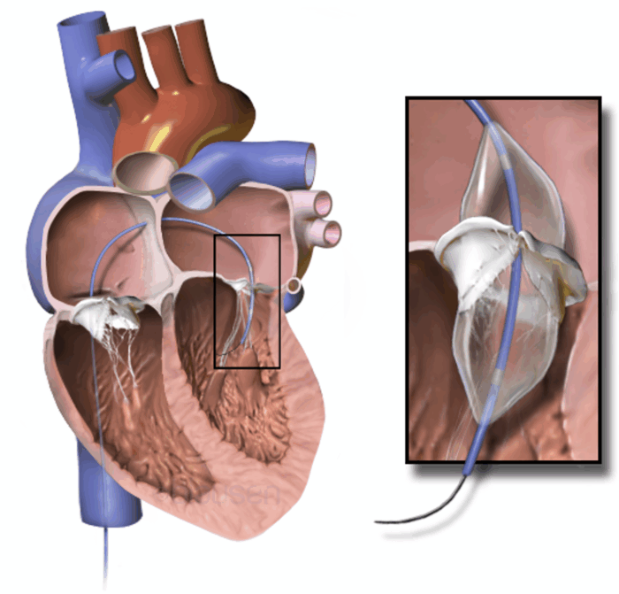 Figure 1. Percutaneous mitral balloon commissurotomy. Guidewire is inserted through the femoral vein to the inferior vena cava and right atrium, across the interatrial septum, and to the left atrium. The balloon is subsequently placed across the mitral valve. Source: Wikimedia Commons. Blausen Medical Communications, Inc. CC by SA. Link