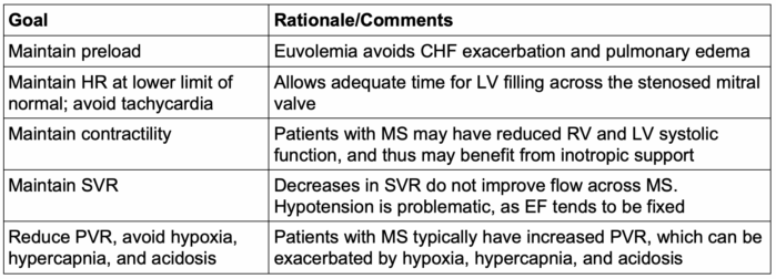 - Intraoperative hemodynamic management of patients with mitral stenosis (MS) involves maintaining a normal sinus rhythm, ensuring adequate preload/euvolemia, avoiding tachycardia (maintaining a low normal heart rate), increasing contractility, and keeping afterload within normal limits.