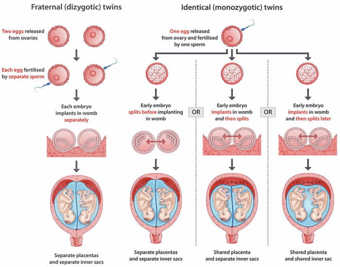 Figure 1. Dizygotic and monozygotic twins. Source: Mashamba T. Types of multiple pregnancy. IntechOpen. CC-BY 3.0. Link