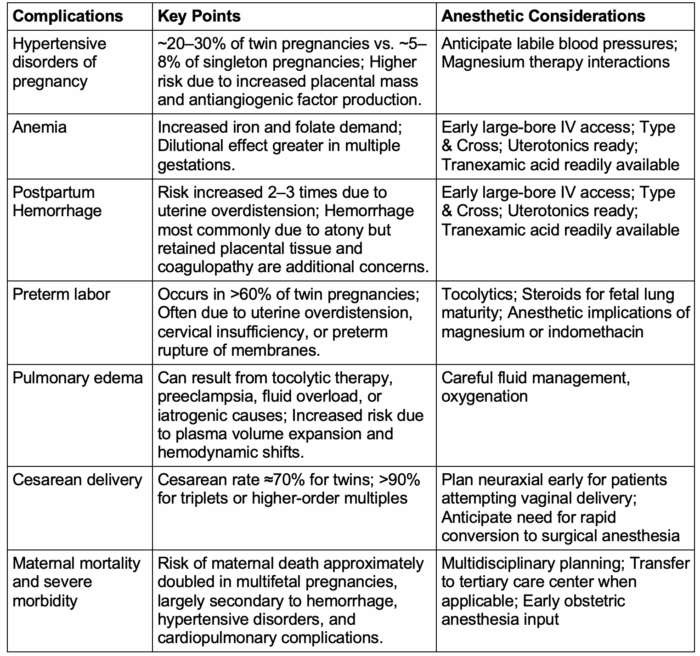 - Parturients with multifetal gestations have 2–3 times the risk of hypertensive disorders, anemia, hemorrhage, and cesarean delivery.