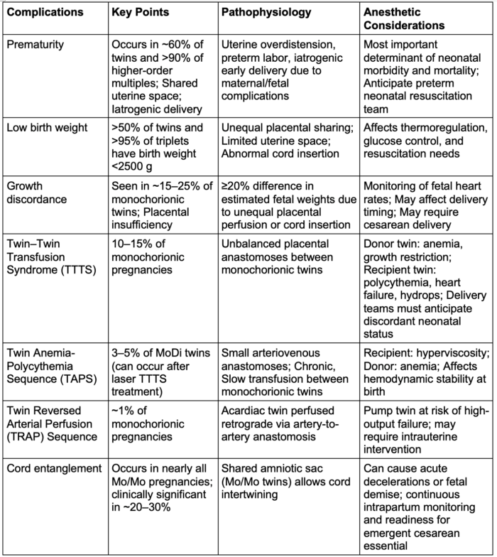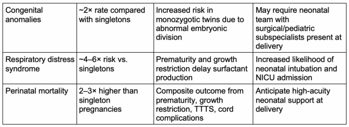 - Risks: Increased risk due to prematurity, low birth weight, and varied chorionic and amniotic configurations.