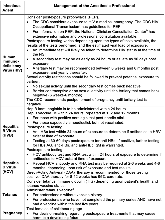 - If the patient’s blood is positive for a transmissible illness, Table 1 lists the management of the anesthesia professional following the NSI.
