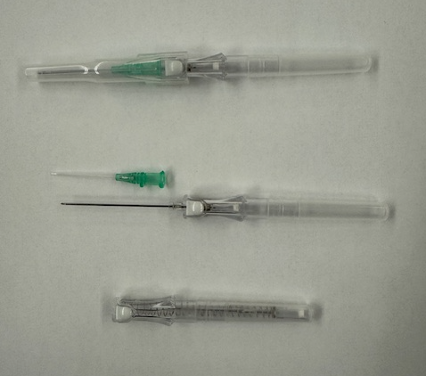 Top: catheter before insertion. Middle: catheter showing cannula (with green hub) and introducer needle removed from cannula. Bottom: Needle retracted into safety device after the white button is pushed.
