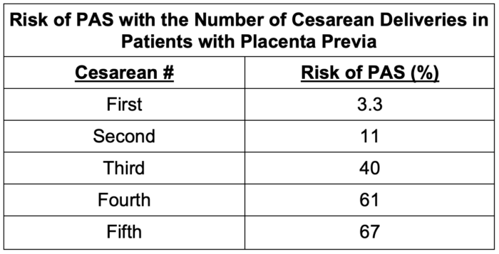 - The risk of PAS also significantly increases in women undergoing their third or greater cesarean delivery.