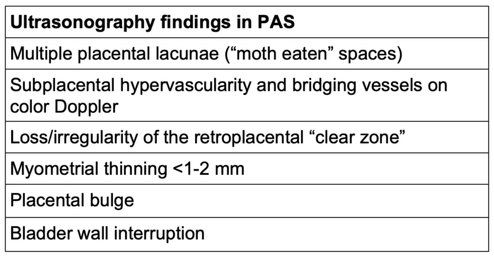 - Ultrasonography (USG) is the primary diagnostic tool for PAS.1 The following are USG findings that can correlate with a diagnosis of PAS: