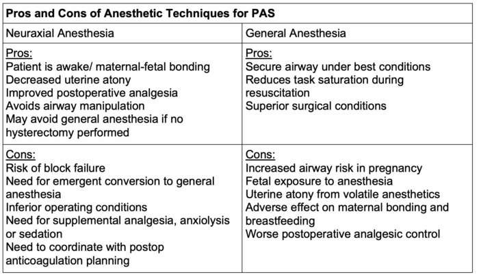 - General anesthesia, neuraxial anesthesia, or neuraxial anesthesia with planned or unplanned intraoperative conversion to general anesthesia have been utilized for the anesthetic management of cesarean hysterectomy and PAS.