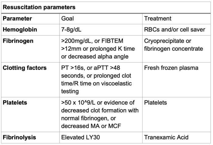 - Resuscitation should occur with goal-directed therapy with viscoelastic testing to reduce the amount of blood products transfused and reduce transfusion-associated complications.7