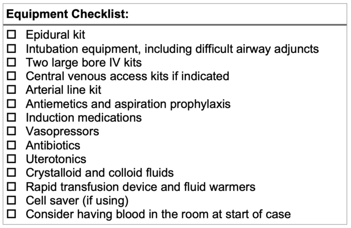 - A multidisciplinary team, including obstetricians and maternal-fetal medicine specialists (OB/MFM), obstetric anesthesia, gynecological oncology, urology, blood bank, neonatal intensive care unit (ICU), and interventional radiology (IR), must be available.