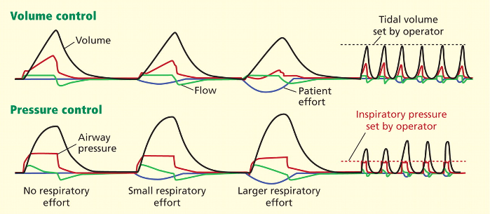 Figure 1. Volume control versus pressure control ventilation. The x-axis represents time. In pressure support ventilation, tidal volume is determined by the patient's inspiratory effort.5