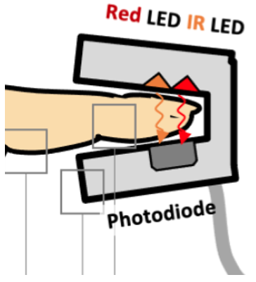 - The pulse oximeter consists of two parts: 1) two light-emitting diodes of different wavelengths constantly emitting infrared and red light, and 2) the photodetector. The two parts are placed parallel to each other, with the sample site (such as the ear, finger, toe, etc.) positioned between them.4 This setup can be seen below in Figure 1.