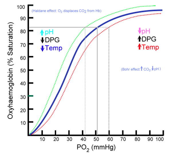 Figure 2. The oxyhaemoglobin dissociation curve. Source: Ratznium. Oxyhaemoglobin Dissociation Curve [graph]. Wikimedia Commons. 2006. Public domain. Link