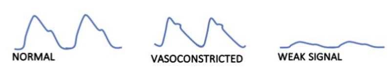 - The changes to the waveform produced by pulse oximetry during vasoconstriction are shown in Figure 3 below. When peripheral perfusion has dropped significantly or the probe is placed in a position that does not allow for the detection of arterial pulsations, the waveform may appear as a “Weak Signal” label, as shown below.