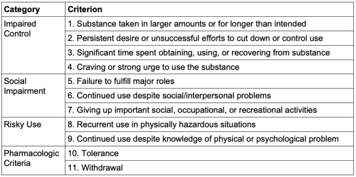 - Per the Diagnostic and Statistical Manual of Mental Disorders, 5th edition (DSM-5), a diagnosis of SUD requires at least 2 of the following symptoms in 12 months:1