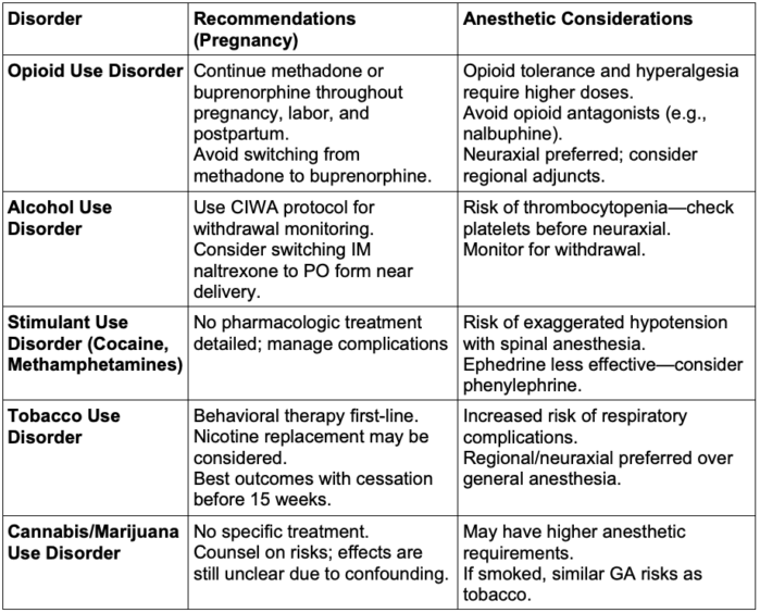 - Neuraxial and regional anesthesia are preferred due to opioid tolerance and the need for multimodal pain control strategies that minimize relapse risk.