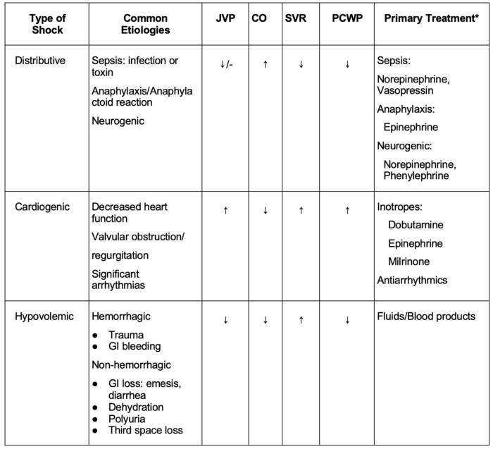 Abbreviations: JVP, jugular venous pressure, CO, cardiac output, SVR, systemic vascular resistance, PCWP, pulmonary capillary wedge pressure, GI, gastrointestinal. *Primary treatment refers to immediate intervention to stabilize a patient.