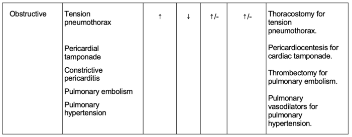 - Obstructive: shock secondary to reduced CO from extracardiac causes, limiting forward circulatory flow.