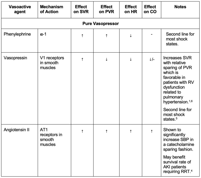 - Pure vasopressor: Predominantly increases vascular tone or systemic vascular resistance (SVR) without significant impact on cardiac contractility (examples: phenylephrine, vasopressin, angiotensin II)