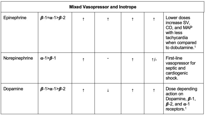 - Mixed vasopressor and inotrope: Increases SVR and cardiac contractility (examples: epinephrine, norepinephrine, dopamine)