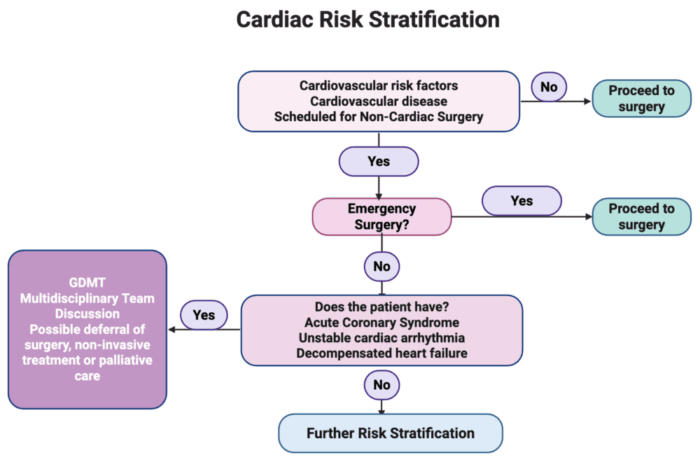 Figure 1. Cardiac risk stratification. Assessment of acute cardiac conditions. Abbreviation: GDMT, Guideline-Directed Medical Therapy. Created in BioRender. Mohamed, B. (2025) Link