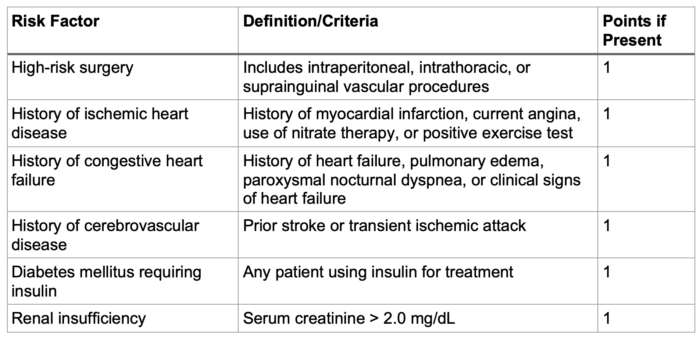 - One of the commonly used risk assessment tools is the Revised Cardiac Risk Index (RCRI). Tables 1 and 2 summarize the criteria and the calculated risk based on RCRI.